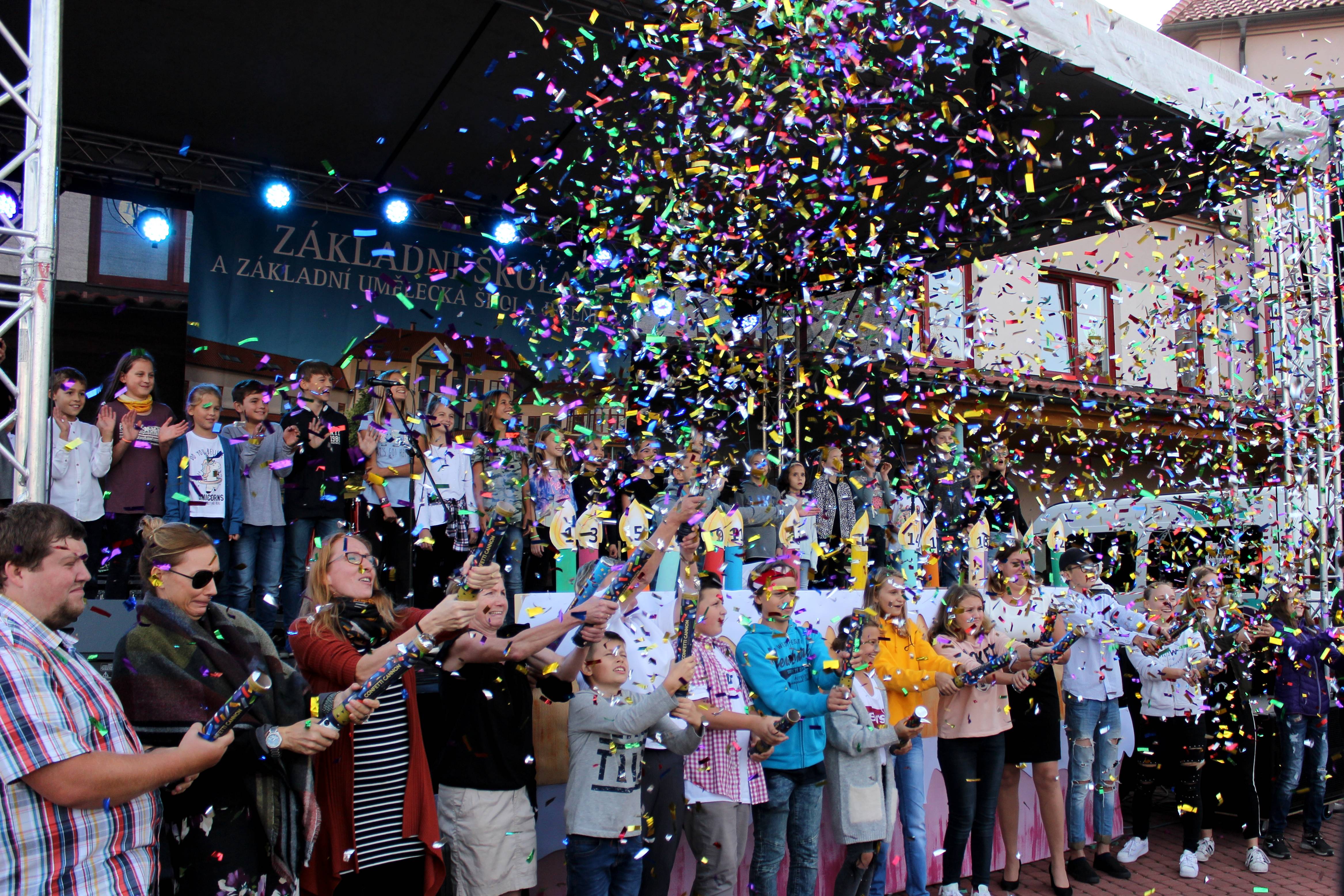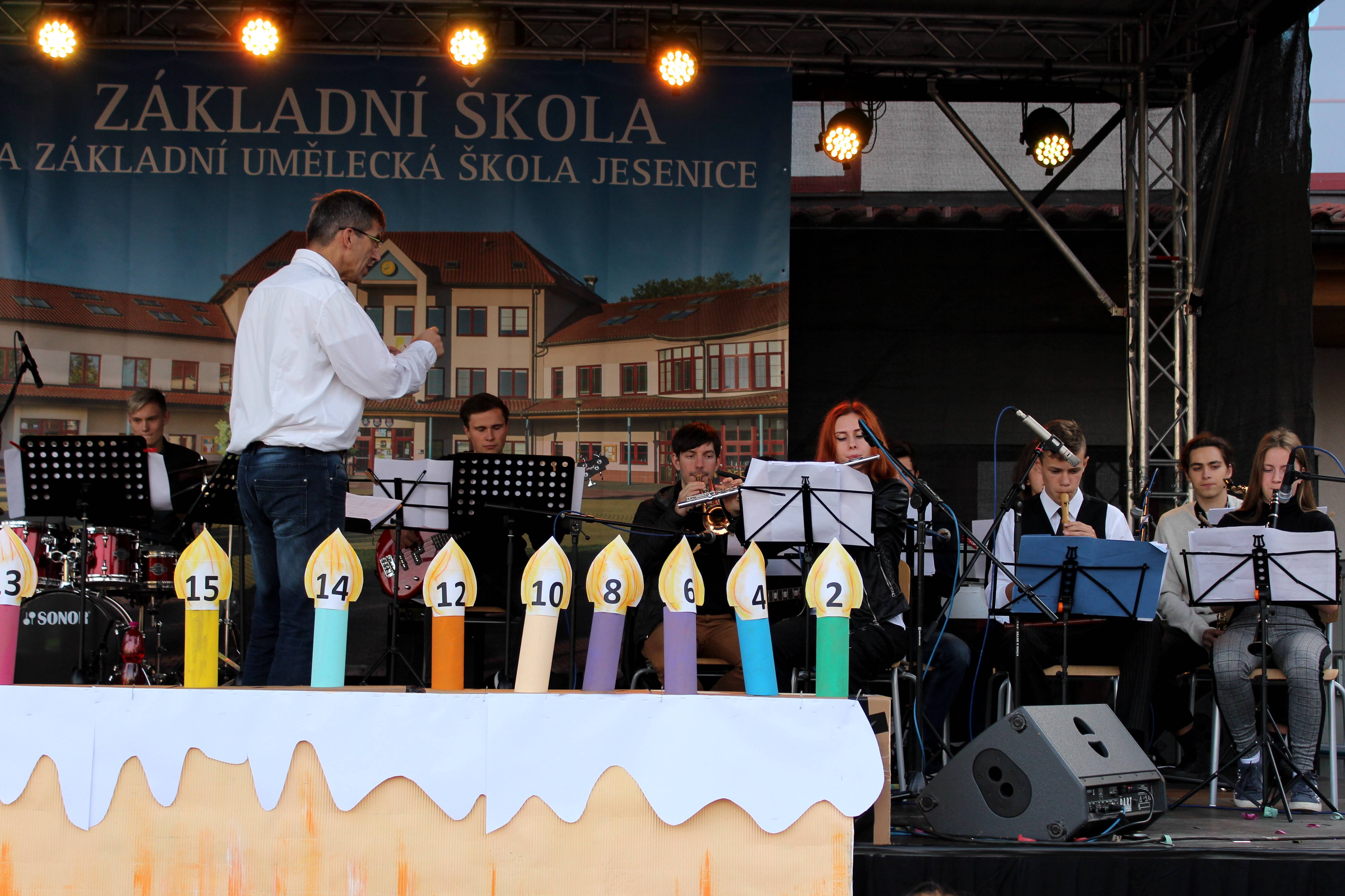 V úterý 9. října 2018 jsme si společně s žáky, rodiči a přáteli připomněli 15. výročí otevření školní budovy ZŠ a ZUŠ Jesenice v ulici K Rybníku 800. Oslavu jsme připravovali několik týdnů a program byl vskutku pestrý. Jeho součástí byly už od 14 hodin hry pro děti na několika stanovištích na školní zahradě, kde měl kromě soutěžních disciplín ve skákání v pytli a vybíjené velký úspěch také skákací hrad. Hlavním bodem oslav bylo pásmo vystoupení na pódiu instalovaném před školou. Po slavnostním úvodu v 15 hodin se během šedesáti minut postupně přišli představit žáci všech ročníků a předvedli blahopřání v mnoha podobách. Zástupci těch nejmenších zpívali v doprovodu svých učitelek, větší pak přednášeli, hráli na hudební nástroje, tančili nebo ztvárňovali historii školy a ve scénkách ukazovali, jak vidí život ve škole svýma očima. Uměleckou tečkou za vystoupením žáků bylo sólové vystoupení houslistky Andrey Jiskrové, Jarka Šimka a na závěr také kapely Jesband, k níž se připojili i Zuzana Nová a Roman Vojtek. Ke skvělé a pohodové atmosféře slavnostního odpoledne přispělo nejen krásné počasí, šikovní žáci a milí hosté, ale také vynikající moderátor, který nás všechny provázel celým programem – pan učitel Lukáš Smola. Všichni účinkující si svou chvíli slávy moc užili a věříme, že své nadšení přenesli i na diváky. Těšíme se společně na viděnou při další příležitosti!
