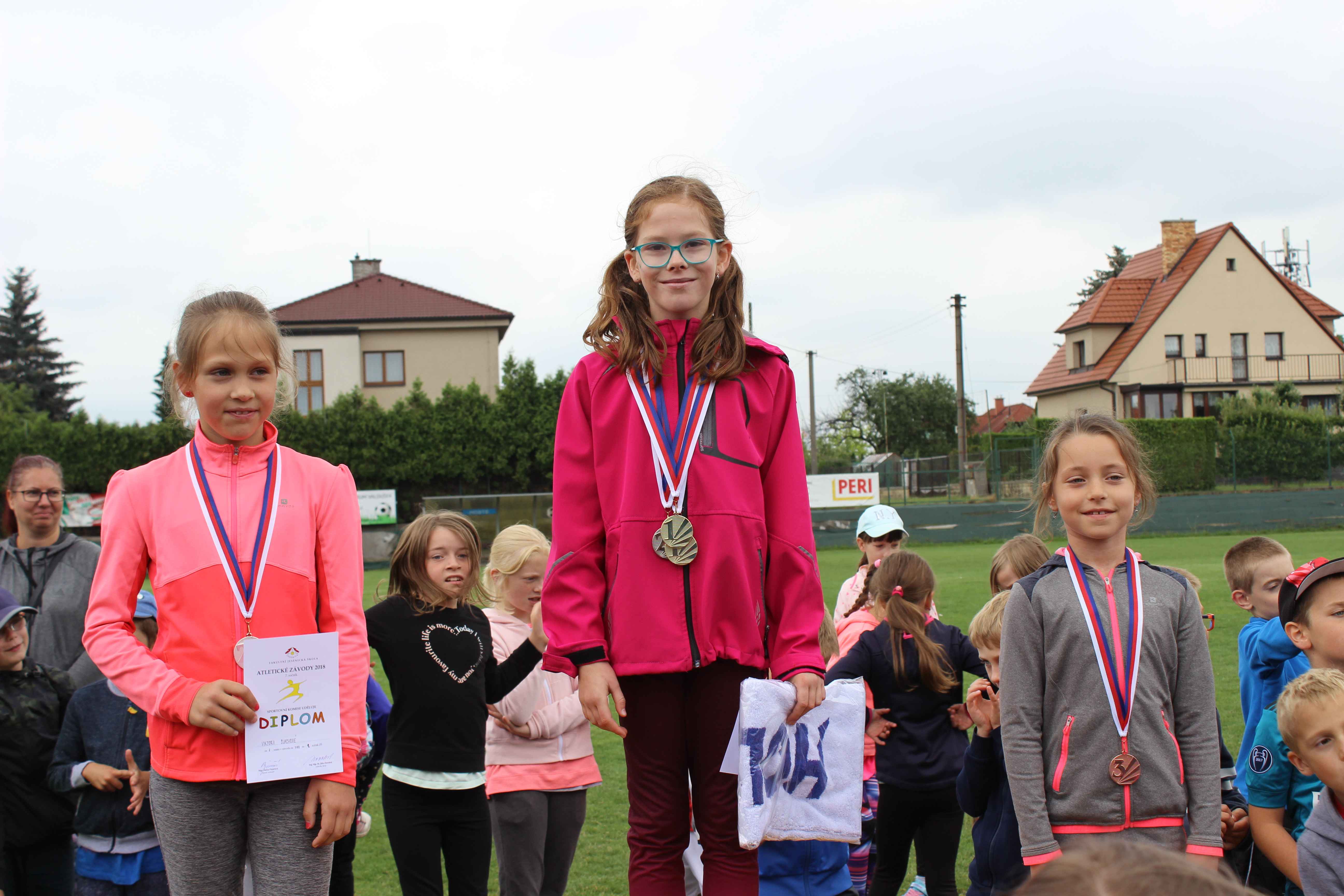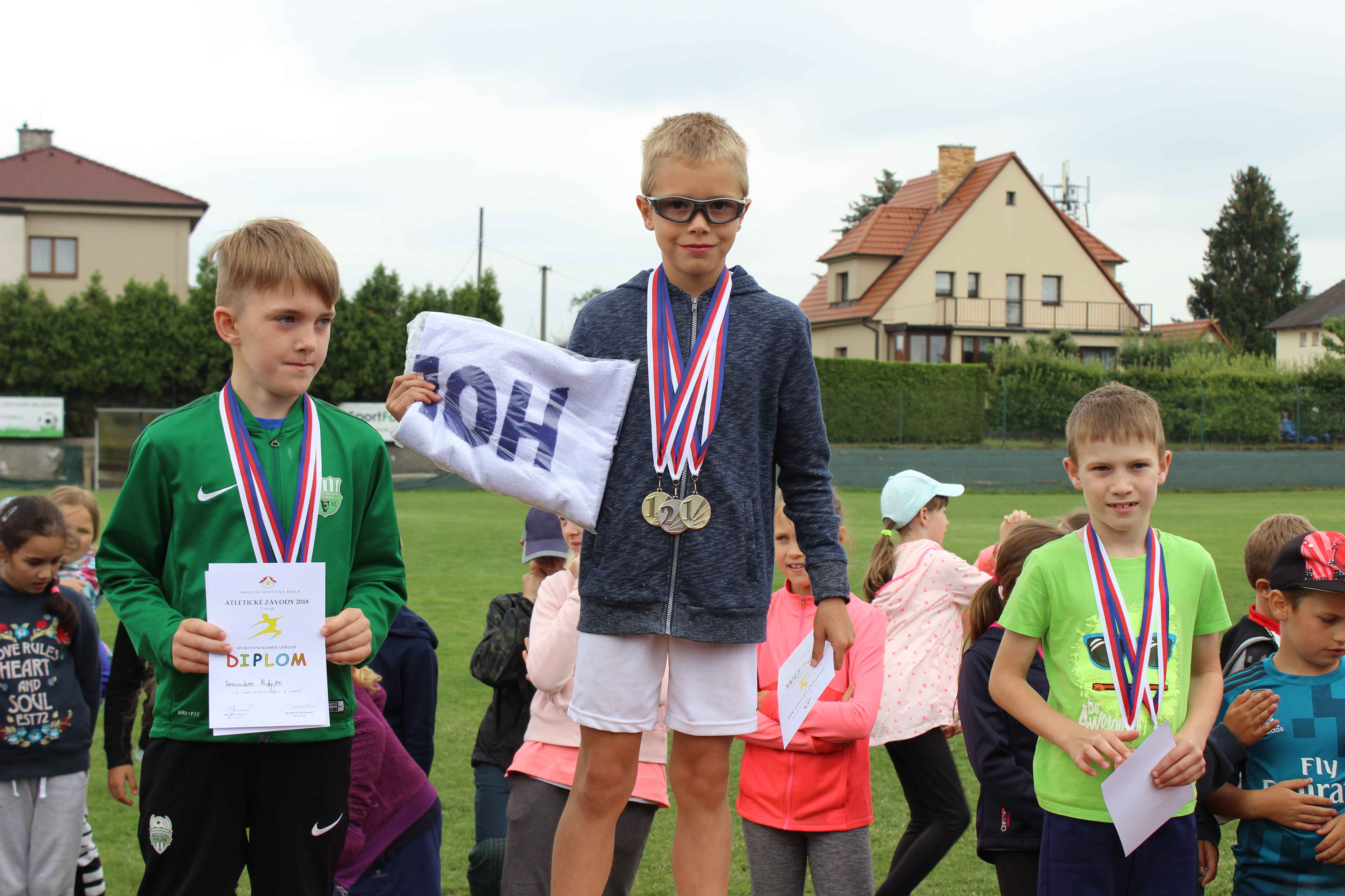 Dne 14. června 2018 se konaly na travnatém fotbalovém hřišti SK Jesenice atletické závody pro 0. až 2. ročník. Soutěžilo se v tradičních disciplínách – v běhu na 50m, ve skoku do dálky z místa, v hodu tenisovým míčkem a ve vytrvalostním běhu na 200 a 400m. Sice počasí zrovna neoplývalo teplotou z minulých dní, ale všichni malí soutěžící projevili sportovního ducha a soutěžili i v duchu fair play. Na organizaci se podíleli naši deváťáci a zároveň jim v jednotlivých disciplínách velmi fandili. Jsem ráda, že tradice těchto závodů stále pokračuje a i ostatní ročníky 3. – 9. si tyto disciplíny prožijí na zářijovém Týdnu sportu.
