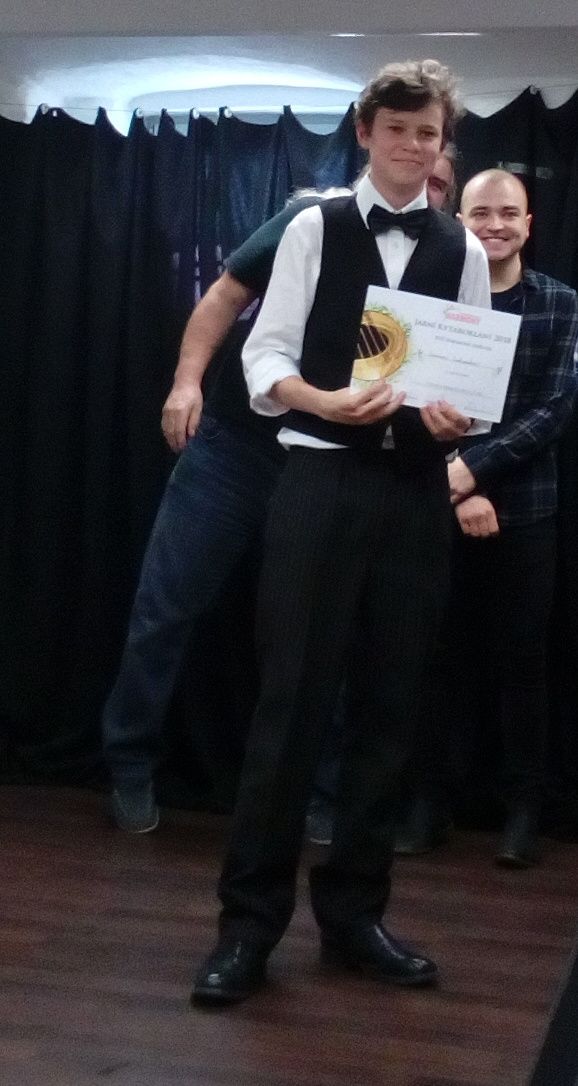 Porota, ve složení Rudolf Rožďalovský, Jaroslav Tauber a Ondřej Bezvoda, rozdala na závěr soutěže medaile, diplomy a krásné ceny. Anetka ve své kategorii získala druhé místo a Ivan první. Oběma kytaristům i jejich pedagogům gratulujeme!!