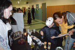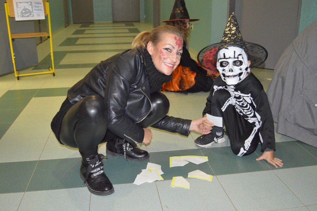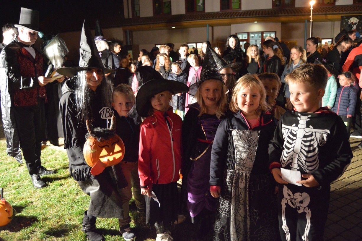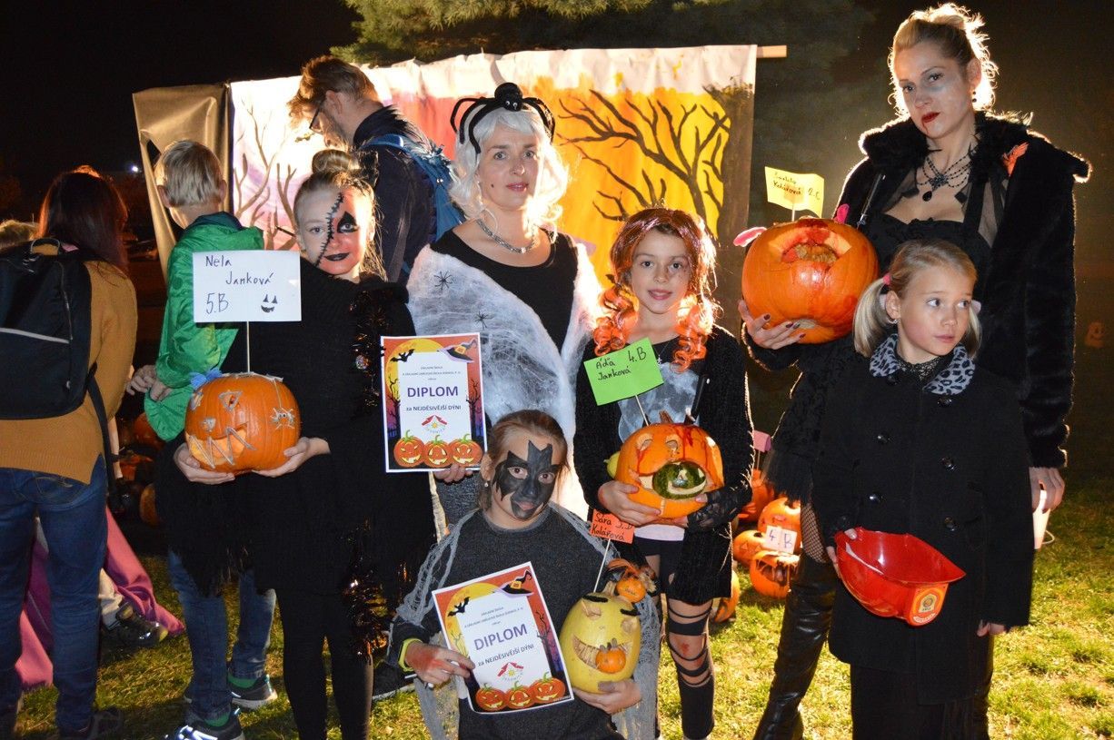 V podvečerní čas ve středu 23. října se to ve škole hemžilo nejrůznějšími strašidly, strašidýlky, čarodějnicemi, kostlivci a další strašidelnou havětí dospělou i zcela nezletilou, kdy se všichni společně přišli před sice importovaným, ale dnes již zažitým a u dětí oblíbeným svátkem „Halloween“ pobavit, zasoutěžit si, ochutnávat lektvary vlastnoručně vyrobené, ale také ty donesené z maminčiny kuchyně v podobě nejrůznějších bábovek či jiného pochutnání, které v rekordním čase zmizelo v útrobách strašidelných návštěvníků. Na soutěže v balení mumií, skládání roztrhaných čarodějnických receptů, určování vůní u „babky kořenářky“, vaření lektvarů u Štěpánky a rytíře Jakuba a celé řady dalších se stály fronty a dlužno dodat, že všechna strašidýlka byla ukázněná, neprala se a nehádala, nikdo se také nebál a bavili se všichni bez ohledu na věk či strašidelnou kategorii. Závěr dvouhodinového reje před školou i uvnitř školy patřil vyhlášení dýní nikoli nejkrásnějších, ale nejstrašidelnějších! K oceněným autorům tak patřili: Terezka V., Verunka Blažková, Adélka Janková, Sára Kolářová, Lukáš Blažek, Vojta Karásek a celý kolektiv třídy 1. B. Za „strašidelným“ nápadem stál kolega T. Rozsnyó a kolegyně Z. Haubová, na realizaci se podíleli nadšenci z řad pedagogů ZŠ i ZUŠ, školní družiny, ale i sami žáci (výtvarná výzdoba, kulisy), na atmosféře, která tu zcela spontánně vznikla, pak sami návštěvníci, ať už zde strašili, soutěžili či se „jen“ dobře bavili. Poděkování tak patří naprosto všem!!!