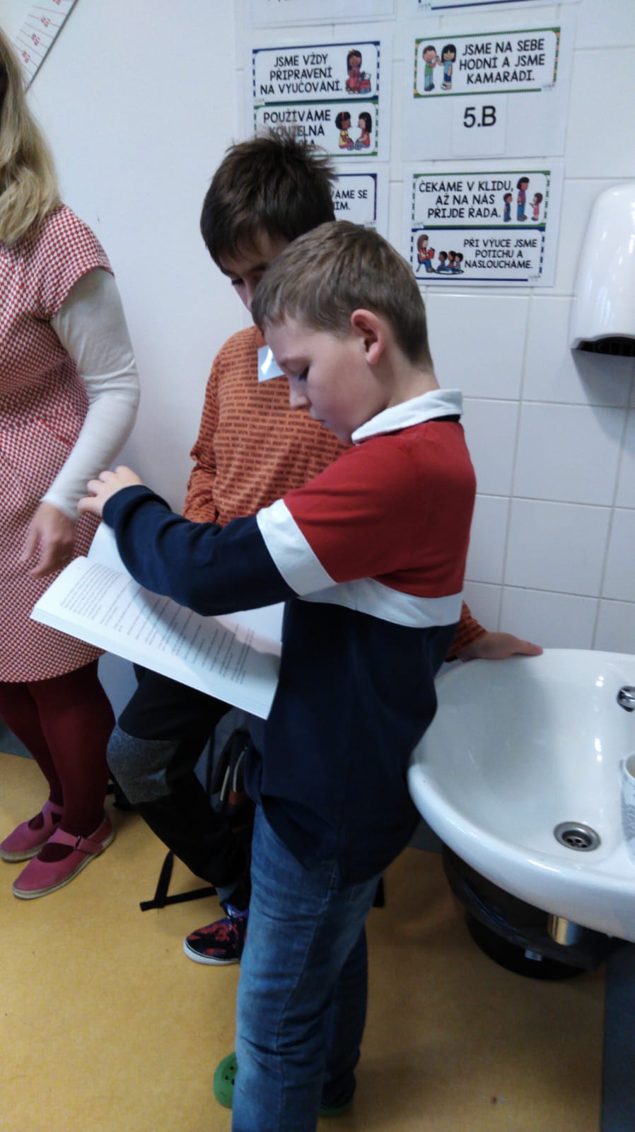 Po rozhovorech jsme přešli k dalšímu zdroji informací, a to čtenému textu. Pohádku z nové knížky Jak maminka vyprávěla o Československu jsme četli dohromady, kousek paní novinářka, děti i paní učitelky. Společně s hlavní hrdinkou příběhu jsme se přenesli do dob naštěstí již dávno minulých. Děti se dozvěděly, jak to dříve vypadalo v českých domácnostech i co nabízel televizní program. Následovala spousta dalších zvídavých otázek a odpovědí.