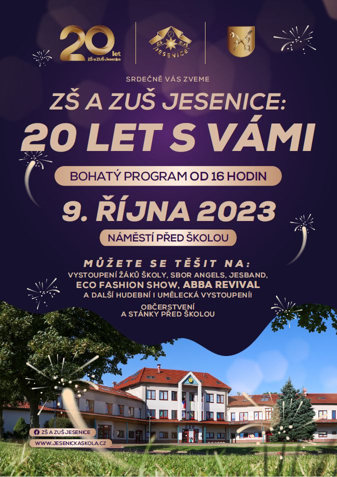 v pondělí 9. 10. 2023 oslaví naše školní budova (K Rybníku 800) 20 let své existence. Dovolte mi, abych Vás co nejsrdečněji pozval na oslavy 20. výročí, které se ve spolupráci s městem Jesenice uskuteční tento den od 16 h na náměstí před hlavní budovou školy. Čeká Vás bohatý kulturní program, jejž vyplní vystoupení našich žáků, sboru Angels, Jesbandu. Oslavy vyvrcholí v 19 hodin koncertem skupiny Abba revival a následnou unikátní laser show. Budeme se na Vás těšit.
