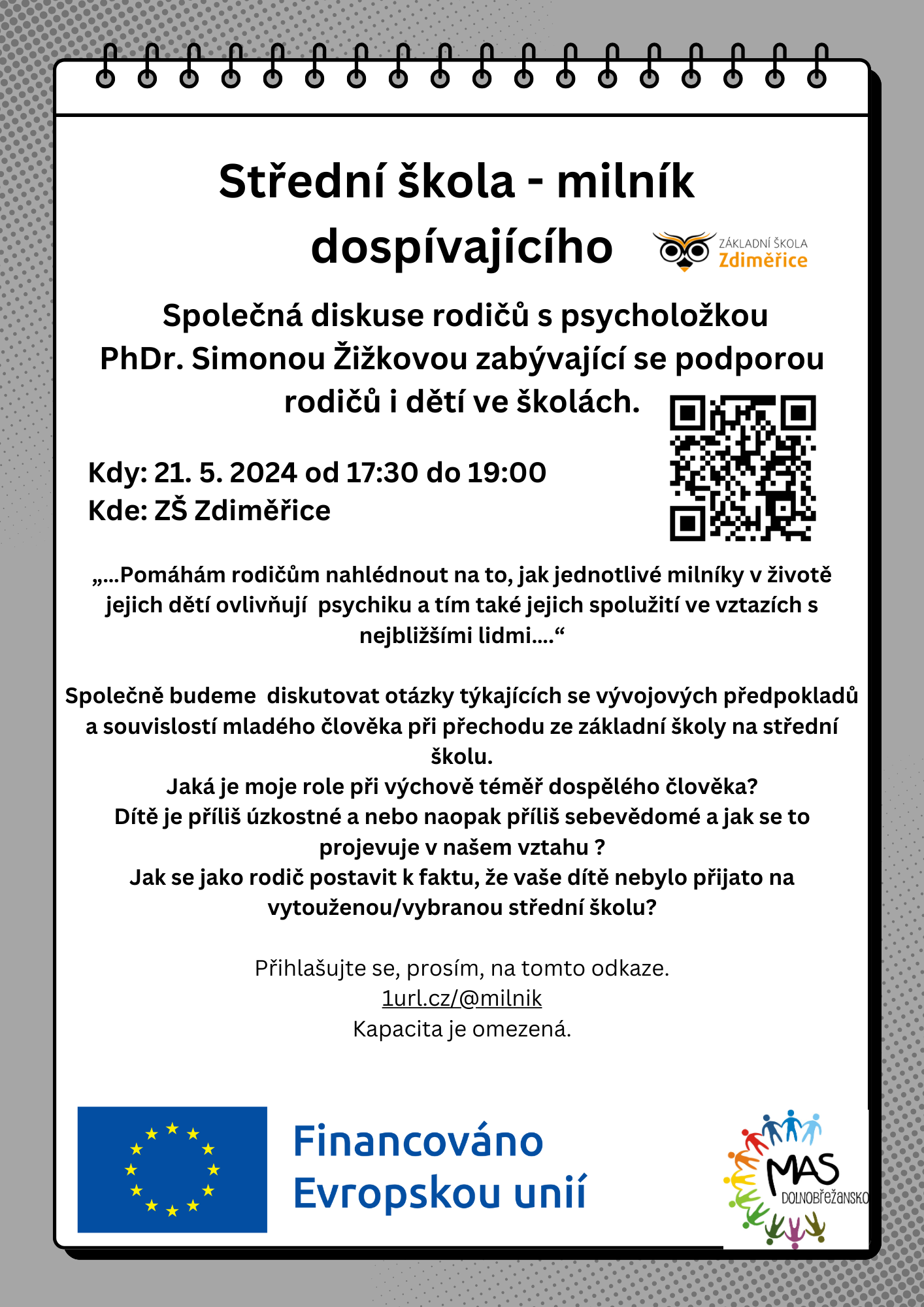 MAS Dolnobřežansko o.p.s. Vás v rámci projektu OPZ srdečně zve na společnou diskuzi rodičů s psycholožkou PhDr. Simonou Žižkovou na téma „Střední škola – milník dospívajícího“, která je zaměřena na podporu rodičů i dětí ve školách.