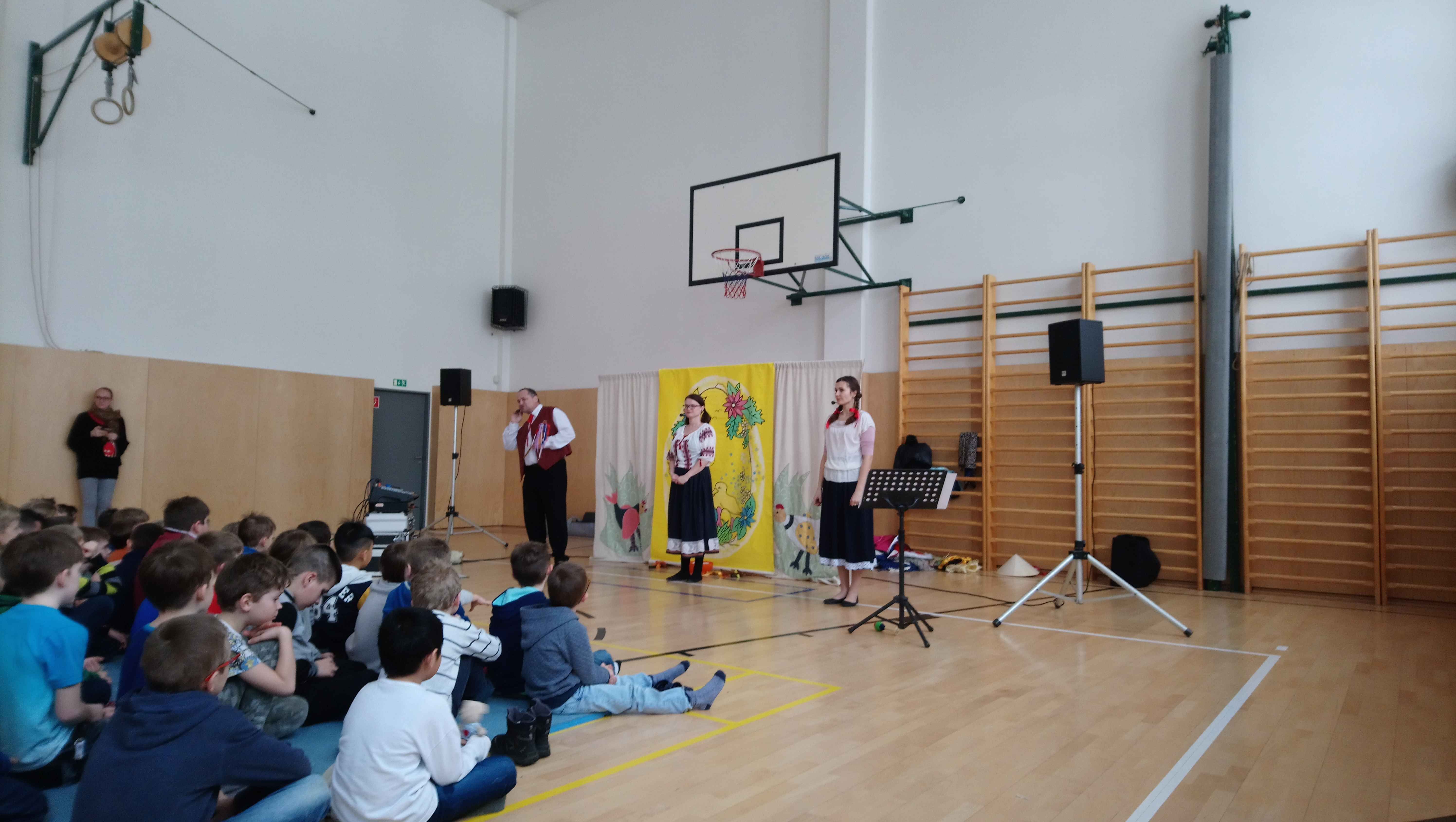 Ve středu 7. 3. 2018 proběhla v malé tělocvičně tři představení „Velikonoce aneb jaro vítej“. Akce byla zaměřena už podle názvu na jaro a Velikonoce. Účinkující v krojích nám zazpívali velikonoční koledy a povídali i o velikonočních tradicích. Představení trvalo asi 1 hodinu a zúčastnili se ho všichni žáci 1. stupně školy. Celkově se mi akce líbila, ale myslím, že byla spíše pro menší děti.