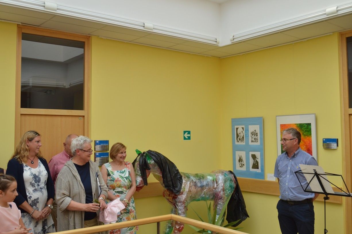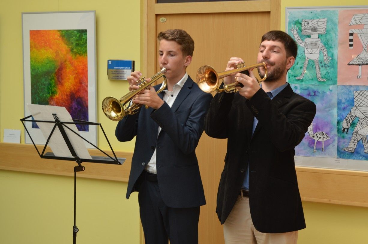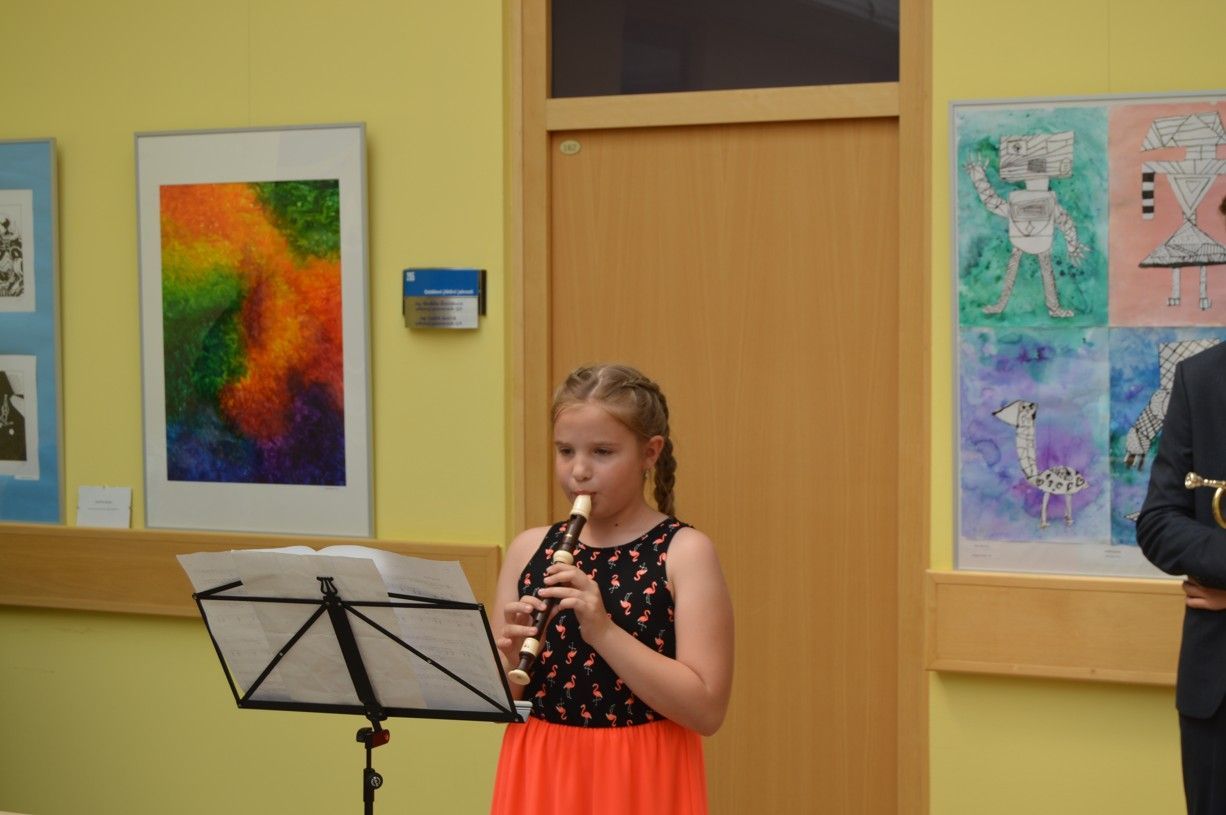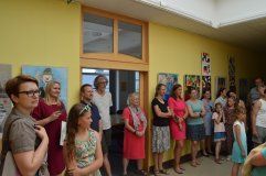 „Úroveň našich malých výtvarníků je stále rok od roku lepší a lepší. Mohu s jistotou říci, že některé naše práce jsou na takové úrovni, že by mohly konkurovat leckterým středním uměleckým školám.“ To jsou slova Jitky Wernerové, akademické sochařky, která je jednou ze dvou pedagožek, které se v základní umělecké škole věnují vzdělávání malých i větších žáků, kteří si takto rozšiřují a prohlubují své schopnosti ve výtvarné tvorbě. Její slova k otevření výstavy a k vystaveným dílům přečetla návštěvníkům B. Lvová, protože náročnost instalace a horké počasí vykonaly své a J. Wernerová musela být ze zdravotních důvodů z účasti na vernisáži omluvena. Výstava, která byla slavnostně otevřena v atriu firmy Ferring-Léčiva, a.s., představuje průřez celoroční prací všech žáků výtvarného oboru ZUŠ a ukázku prací absolventky I. cyklu Kateřiny Kyselé ze třídy MgA. Pavly Naďové. Malba, kresba, keramika, exponáty trojrozměrné, to vše opět na nějaký čas rozzářilo prostory atria, jak zmínil v úvodním slovu ředitel firmy ing. P. Hořínek. Absolventce i její učitelce pak poděkovala ředitelka školy Mgr. J. Novotná. Potěšila i návštěva starosty města ing. P. Smutného, který spolu se zastupitelkou a předsedkyní kulturní komise ing. J. Vidímovou krátce zmínil přínos existence ZUŠ nejen k rozvíjení spolupráce mezi jednotlivými subjekty města, ale ke kulturnímu životu Jesenice vůbec. Vernisáž již tradičně doplnilo vystoupení žáků hudebního oboru ZUŠ, kdy slavnostní fanfáry v podání trumpetisty J. Jedličky a jeho učitele J. Šefla zazněly v úvodu a závěru této akce, sólovou hrou na zobcovou flétnu pak proložila jednotlivé proslovy T. Petříčková. Za velkou pomoc při instalaci výstavy je třeba poděkovat kolegovi T. Rozsnyó a nesmírně obětavému panu Šilhovi.